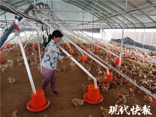 毗鄰磚橋社區(qū)大米加工廠的,是一座建成于2018年的生態(tài)牧場。7月16日下午,在牧場大棚里,年逾五旬的村民石太鳳照看著剛滿28天的雞仔,按時(shí)給它們添水補(bǔ)充飼料。借助智能調(diào)節(jié)氣溫和水溫的自動(dòng)化設(shè)備,這1.5萬只小雞不需要花費(fèi)太多的精力照料。經(jīng)過90天的標(biāo)準(zhǔn)生長周期,這批肉雞就能出欄了。