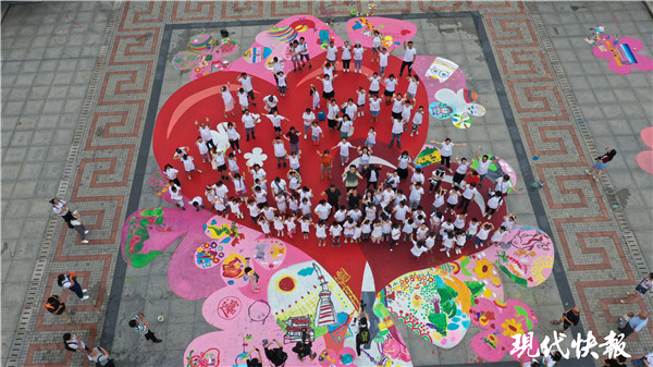 無(wú)錫太湖廣場(chǎng)圖案總設(shè)計(jì)師、鳳凰畫材集團(tuán)藝術(shù)總監(jiān)徐偉介紹:“關(guān)于愛(ài),雙愛(ài)心是最好的表現(xiàn),周邊散落的花瓣是櫻花,也是無(wú)錫的象征之一,這些構(gòu)成了太湖廣場(chǎng)愛(ài)主題的基底畫,孩子們可在基底畫上創(chuàng)作自己關(guān)于愛(ài)的主題畫。”