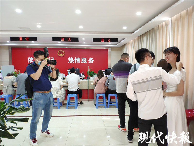像是約好了一樣,當(dāng)天穿著禮服、戴著白紗的還有好幾個(gè)姑娘。28歲的小鄭就是其中之一。在等候領(lǐng)證時(shí),身旁的男友小段不時(shí)幫她整理裙子?,F(xiàn)代快報(bào)記者了解到,這對(duì)小情侶都畢業(yè)于東南大學(xué),研究生期間跑步鍛煉時(shí)相識(shí),在一起五年了。當(dāng)天,和他們一起來婚姻登記處的還有一個(gè)專業(yè)攝影師。
