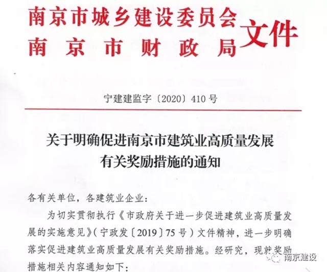 (通訊員 寧建軒 記者 張瑜)建筑業(yè)作為南京的支柱產(chǎn)業(yè),一直備受矚目。近日,南京市建委發(fā)布《關(guān)于明確促進(jìn)南京市建筑業(yè)高質(zhì)量發(fā)展有關(guān)獎(jiǎng)勵(lì)措施的通知》(以下簡(jiǎn)稱《通知》),明確落實(shí)相關(guān)獎(jiǎng)勵(lì)措施,吸引優(yōu)秀外市企業(yè)來(lái)寧落戶,最高獎(jiǎng)勵(lì)達(dá)500萬(wàn)。此外,也多措并舉鼓勵(lì)本地建筑企業(yè)發(fā)展,比如拿到“魯班獎(jiǎng)”等獎(jiǎng)項(xiàng)的,也會(huì)給予真金白銀的獎(jiǎng)勵(lì)。