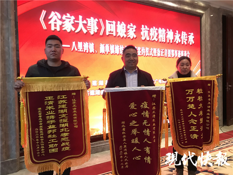 “老徐一家捐贈(zèng)的大米,為我鎮(zhèn)打贏疫情阻擊戰(zhàn)提供了強(qiáng)力支持,體現(xiàn)了大家庭的溫暖。”在現(xiàn)場(chǎng),湖北黃岡市紅安縣八里灣鎮(zhèn)鎮(zhèn)長(zhǎng)李順祥介紹了當(dāng)?shù)厣舷乱恍墓餐挂叩氖论E,表達(dá)對(duì)徐正青一家的感激之情,同時(shí)與建湖縣顏單鎮(zhèn)締結(jié)為友好鎮(zhèn)。