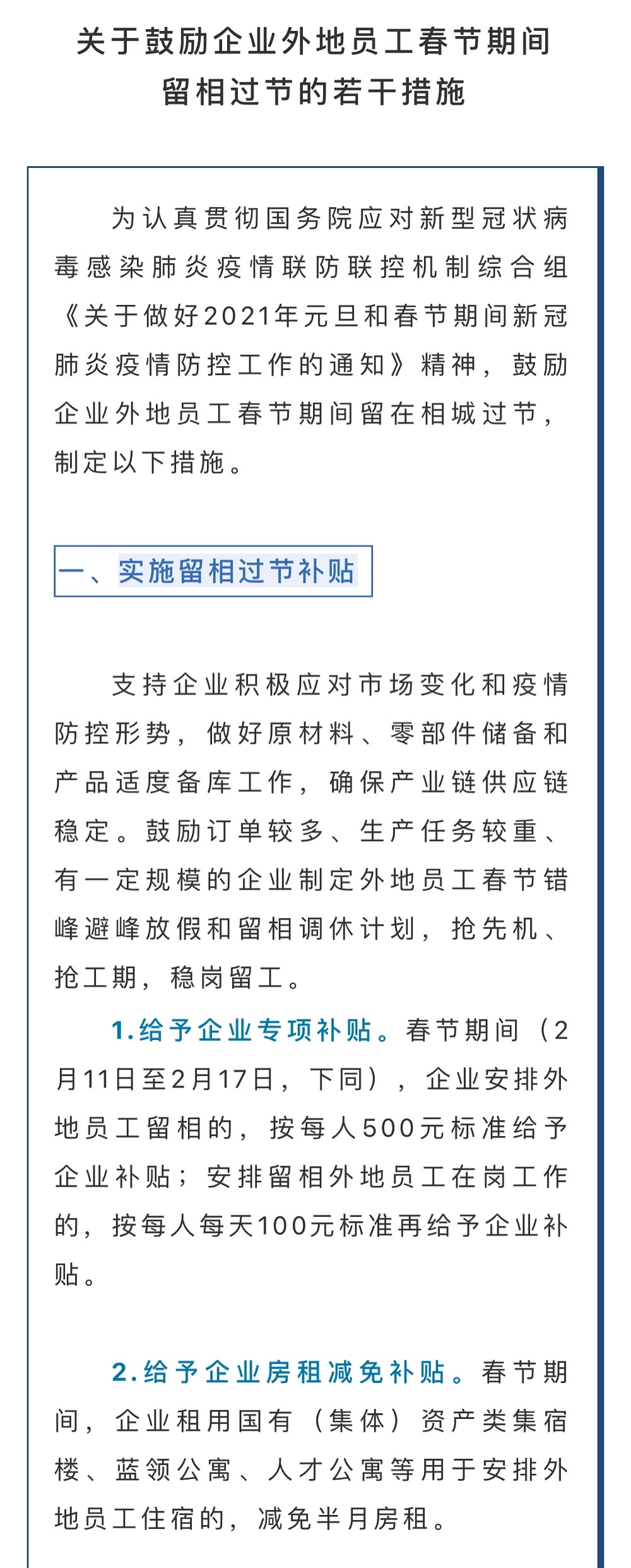 根據(jù)《措施》, 2月11日至2月17日期間(以下簡稱“春節(jié)期間”),企業(yè)安排外地員工留相的,按每人500元標(biāo)準(zhǔn)給予企業(yè)補(bǔ)貼;安排留相外地員工在崗工作的,按每人每天100元標(biāo)準(zhǔn)再給予企業(yè)補(bǔ)貼。春節(jié)期間,企業(yè)租用國有(集體)資產(chǎn)類集宿樓、藍(lán)領(lǐng)公寓、人才公寓等用于安排外地員工住宿的,減免半月房租。