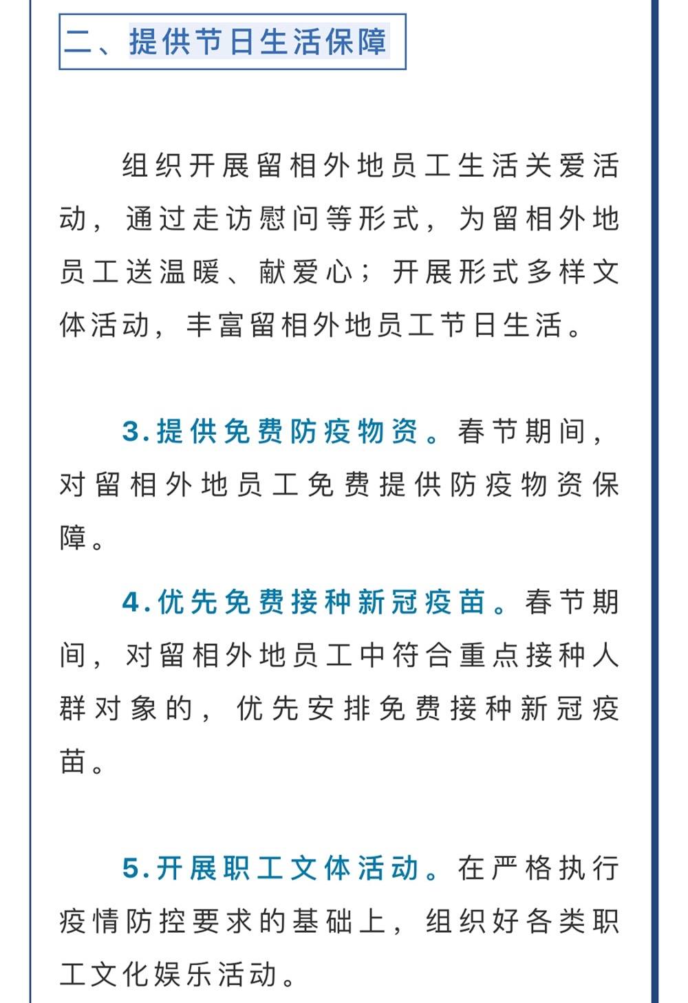 《措施》提出,將組織開展留相外地員工生活關(guān)愛活動,通過走訪慰問等形式,為留相外地員工送溫暖、獻(xiàn)愛心;開展形式多樣文體活動,豐富留相外地員工節(jié)日生活。