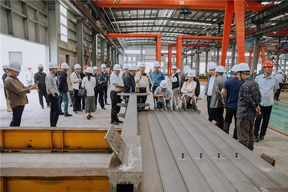 在觀摩環(huán)節(jié),與會嘉賓還前往參觀了江蘇江海杭蕭鋼結(jié)構(gòu)裝配式生產(chǎn)基地,在相關(guān)負責人的詳細介紹中全方位了解車間全自動智能化的生產(chǎn)設(shè)備和鋼結(jié)構(gòu)構(gòu)件的生產(chǎn)過程。完成走訪后,到場嘉賓一致認為,鋼結(jié)構(gòu)裝配式建筑有著其它建筑類型不可比擬的優(yōu)勢,江蘇江海杭蕭不僅在技術(shù)上有創(chuàng)新,在鋼結(jié)構(gòu)加工質(zhì)量上也具有較強競爭力。