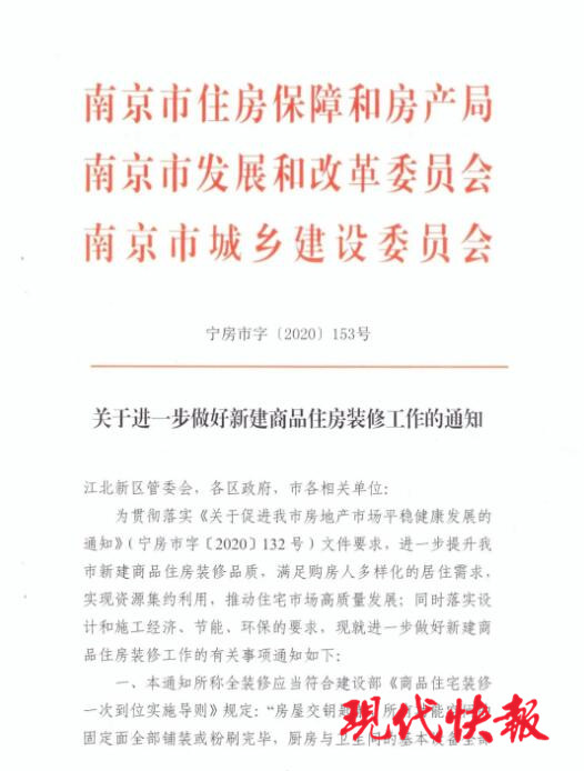 (記者 張瑜)買(mǎi)精裝修房變“驚裝”?交房后精裝標(biāo)準(zhǔn)縮水?以后這些問(wèn)題不愁了!8月27日,現(xiàn)代快報(bào)記者獲悉,南京市住房保障和房產(chǎn)局、南京市發(fā)展和改革委員會(huì)和南京市城鄉(xiāng)建設(shè)委員會(huì)日前聯(lián)合發(fā)布《關(guān)于進(jìn)一步做好新建商品住房裝修工作的通知》(以下簡(jiǎn)稱《通知》),明確以后南京人買(mǎi)新房可自愿選擇全裝修或升級(jí)裝修方案;規(guī)范樣板間硬裝部分必須與交付一致,讓購(gòu)房者“所見(jiàn)即所得”。此外,全裝修、升級(jí)裝修標(biāo)準(zhǔn)也都明確了,沒(méi)有恒溫恒濕和新風(fēng)系統(tǒng)的全裝修標(biāo)準(zhǔn)不低于1500元/平方米。據(jù)悉,《通知》自2020年8月14日起實(shí)施,凡是南京市通過(guò)“限房?jī)r(jià)、競(jìng)地價(jià)”模式出讓的地塊一律采用。