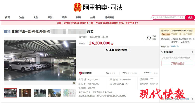 司法拍賣頁(yè)面顯示,甘薇所持有的該套房產(chǎn),建筑面積為193.59平方米,登記時(shí)間為2017年5月31日。該套房產(chǎn)的市場(chǎng)評(píng)估價(jià)為2206萬(wàn)元,起拍價(jià)為1545萬(wàn)元。參與競(jìng)拍的競(jìng)買人需繳納保證金155萬(wàn)元。值得注意的是,上述標(biāo)的拍賣成交后,泛海國(guó)際蘭海園一個(gè)地下車位也同時(shí)成交,拍賣成交價(jià)款包含47萬(wàn)元車位成交價(jià)款。