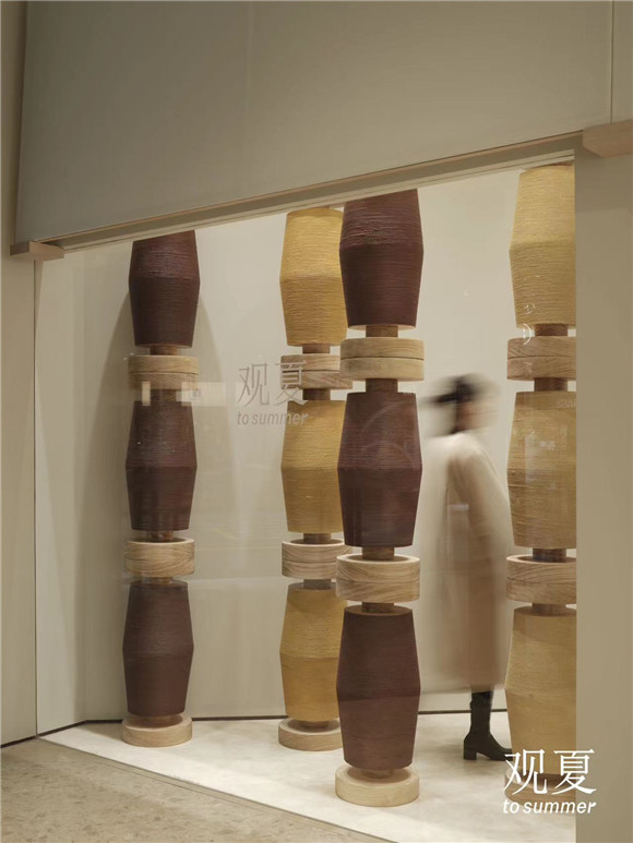 觀夏云坊的空間設(shè)計(jì)靈感來(lái)源于匠人創(chuàng)作云錦的過(guò)程,用空間之美講述一絲一線編織而成的故事。云錦織布機(jī)體型高大,需要一對(duì)云錦匠人同時(shí)親密合作才能運(yùn)轉(zhuǎn),織布機(jī)上的絲線和織物要經(jīng)過(guò)很多雙手的反復(fù)觸摸,最終才能成為一件在古代只有皇室才能使用的藝術(shù)品。觀夏云坊外立面裝飾的木棍和棉線,意在模擬織布機(jī)的結(jié)構(gòu)。云錦織布機(jī)的構(gòu)造很特殊,工匠們?cè)诰幙棔r(shí)只能看到云錦背面的經(jīng)緯走勢(shì),也就是“織造”的過(guò)程。