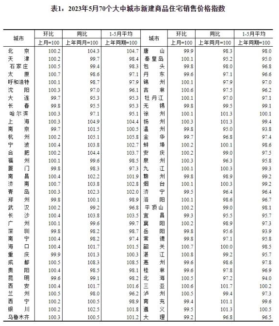 2023年5月70個(gè)大中城市新建商品住宅銷(xiāo)售價(jià)格指數(shù)。 截圖自國(guó)家統(tǒng)計(jì)局官網(wǎng)
