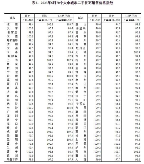2023年5月70個(gè)大中城市二手住宅銷(xiāo)售價(jià)格指數(shù)。 截圖自國(guó)家統(tǒng)計(jì)局官網(wǎng)