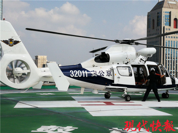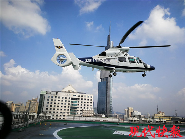 120調(diào)度指揮中心立即啟動整個航空醫(yī)療救護(hù)流程,與南京市公安局特警支隊(duì)警務(wù)飛行大隊(duì)、南京鼓樓醫(yī)院和110指揮中心等單位取得聯(lián)系。10分鐘后,一架警用直升機(jī)趕到指定位置,同時,公安分隊(duì)、地面急救人員也趕到指定位置,艙門開啟,從艙內(nèi)快速走出兩名航空醫(yī)療急救人員。地面等待的急救人員快速上前,協(xié)助機(jī)上醫(yī)護(hù)人員將已現(xiàn)場心肺復(fù)蘇成功的患者轉(zhuǎn)移到直升機(jī)上,直升機(jī)起飛后,航空醫(yī)療急救人員通過院前院內(nèi)一體化信息共享平臺及時向鼓樓醫(yī)院傳輸“患者”信息,暢通院前院內(nèi)一體化綠色通道,整個演練僅用時32分鐘,為患者爭取了寶貴的救治時間。