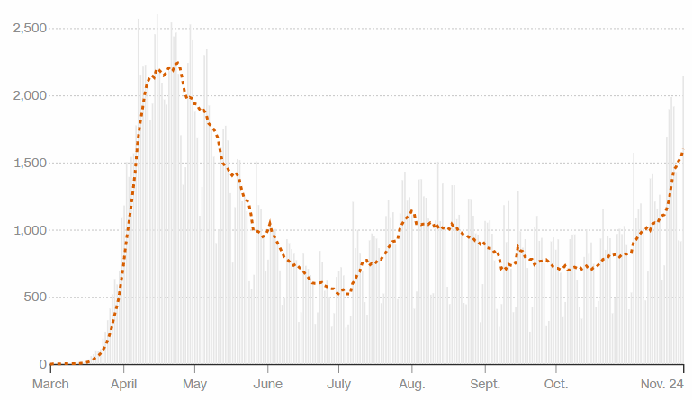約翰霍普金斯大學(xué)數(shù)據(jù)顯示,11月25日,美國(guó)報(bào)告了2046例死亡,這是5月以來(lái)美國(guó)報(bào)告的最多的單日死亡人數(shù)。同時(shí),新增住院人數(shù)也達(dá)到了89954人,連續(xù)16天創(chuàng)下了疫情的紀(jì)錄。