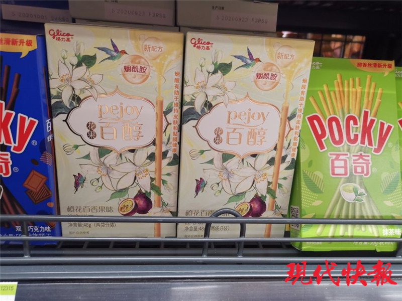 在南京一家知名大型超市里,貨架上擺放著各種各樣的零食。其中有一款名為“百醇”的注心餅干,推出了新的配方產(chǎn)品,被擺放在顯眼的位置上。只見包裝盒上用彩色字體標(biāo)注有“新配方煙酰胺”的字樣,旁邊還有一行小字:“煙酸有助于維持皮膚和黏膜健康”。在背面成分表的最后一項,標(biāo)注有“煙酸(煙酰胺)”,每盒含量為0.6毫克。