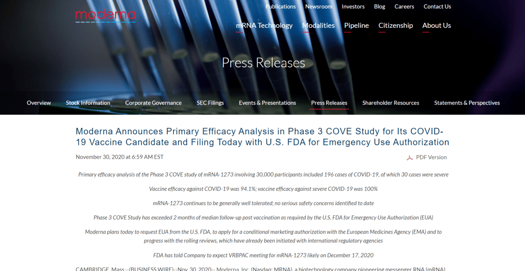 當(dāng)?shù)貢r(shí)間 11 月 30 日,Moderna 公司宣布,其基于 mRNA 技術(shù)的新冠候選疫苗 mRNA-1273 完成 3 期臨床試驗(yàn)中的主要療效數(shù)據(jù)分析。同時(shí),Moderna 宣布計(jì)劃向美國(guó) FDA 申請(qǐng)緊急使用授權(quán)(EUA)和歐洲藥品管理局(EMA)的有條件批準(zhǔn)。