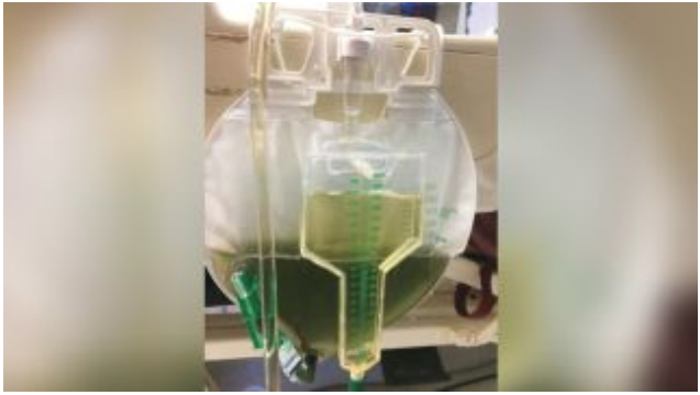 五天后,醫(yī)生發(fā)現(xiàn),該男子的導(dǎo)尿管袋中的尿液變綠了。