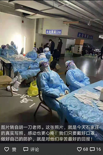 這兩日,這張照片在石家莊朋友圈刷屏。1月6日凌晨3點醫(yī)護人員進入石家莊市裕華區(qū)槐底社區(qū)當(dāng)時,室外溫度達(dá)到了零下12度,地下車庫滴水成冰,累到不行的時候他們才稍微靠著歇一歇。
