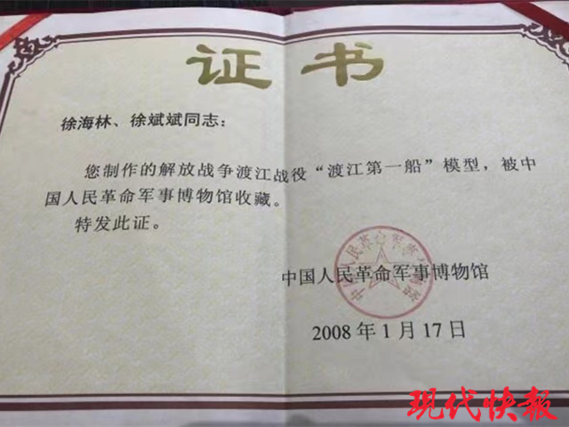 在這樣的背景下,徐海林制作了“渡江第一船”模型。最讓他得意的是,中國軍事博物館的專家們最看到“渡江第一船”船模后,給予了高度評價,并征得他的同意,將該模型收藏于中國人民革命軍事博物館。
