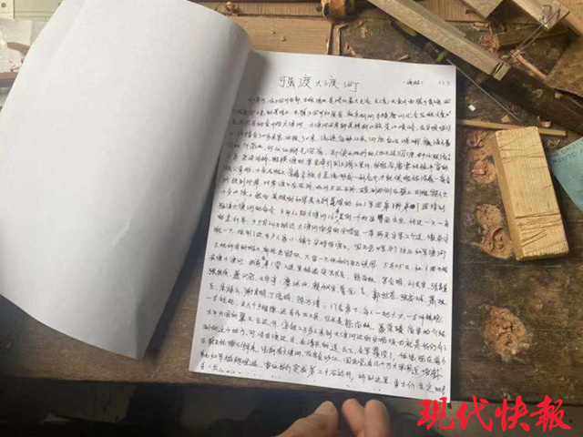 對于這些“寶貝”的創(chuàng)作背景,徐海林可謂是如數(shù)家珍,每一個都做足了功課。在徐海林的工作室中,有兩疊厚厚的紙,詳細(xì)記錄著每一艘船模背后的紅色故事,這些資料一筆一畫都是手寫,足見其工夫。