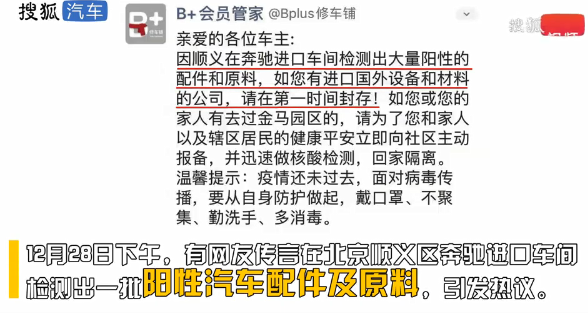 12月28日,有網(wǎng)友傳出在北京順義區(qū)奔馳車間檢測出一批陽性汽車配件及原料。12月29日,搜狐汽車 · 汽車咖啡館致電北京順義區(qū)部分4S店,得到的答復(fù)均是以官方消息為準。不過北京亞奧之星表示目前店面正在消殺,但之后還可以繼續(xù)試駕和買車。另外兩家4S店也表示目前可以進行試駕和預(yù)購,店面消殺不影響銷售。