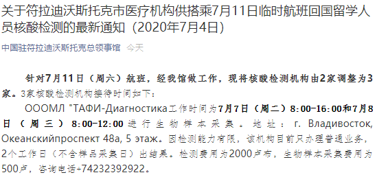據(jù)中國駐符拉迪沃斯托克總領(lǐng)事館微信公號,針對7月11日(周六)航班,經(jīng)我館做工作,現(xiàn)將核酸檢測機構(gòu)由2家調(diào)整為3家。3家核酸檢測機構(gòu)接待時間如下: