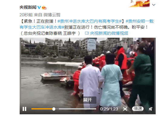 【緊急!正在救援!#貴州沖進水庫大巴內有高考學生#】#貴州安順一載有學生大巴車沖進水庫#救援正在進行!傷亡情況尚不明確。盼平安!(總臺央視記者陳春曉 王皓宇 )