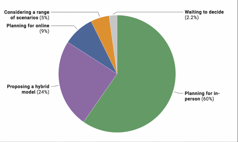 根據(jù)美國《高等教育紀(jì)事報》對1090所美國大學(xué)和學(xué)院的統(tǒng)計,60%的學(xué)校計劃在秋季學(xué)期重啟線下教學(xué),24%的學(xué)校擬采用混合教學(xué)模式。9%的學(xué)校計劃給學(xué)生上網(wǎng)課,其中不乏哈佛大學(xué)這樣的名校。