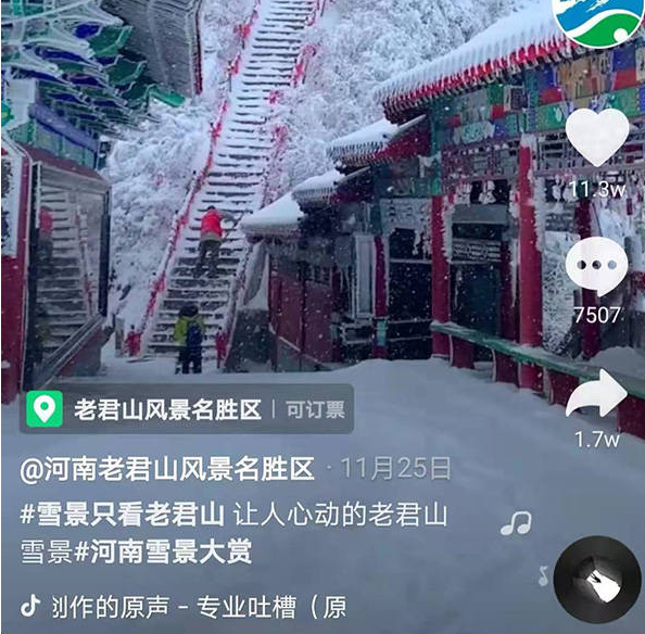 澎湃新聞注意到,老君山雪景的視頻在短視頻平臺(tái)上廣泛傳播。不少博主發(fā)布自己在山頂穿漢服或吃泡面的視頻,有視頻獲贊百萬(wàn)。