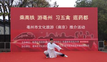 活動(dòng)現(xiàn)場(chǎng)亳州市文化旅游以主持人介紹、宣傳彩頁(yè)、圖片展示等形式向大家詳細(xì)的介紹了亳州市旅游景區(qū)的概況和交通優(yōu)勢(shì)。南京市旅行社代表向游客們推出了“從南京坐高鐵游亳州”的旅游產(chǎn)品,中國(guó)五禽戲傳承人陳陳給大家?guī)砹司式^倫的五禽戲表演,使活動(dòng)推向了高潮。