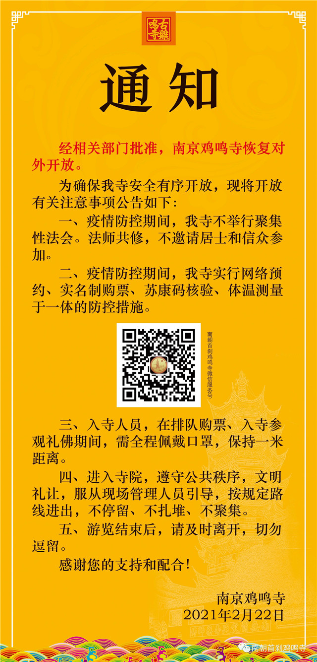 (記者 李鳴)2月22日,現(xiàn)代快報記者了解到,經(jīng)相關(guān)部門批準(zhǔn),雞鳴寺將于2月23日恢復(fù)對外開放。