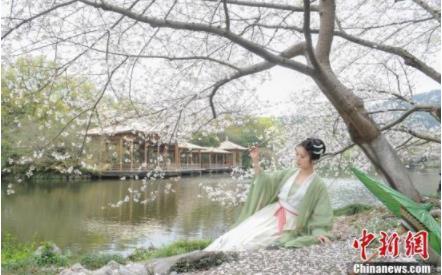 漢服愛(ài)好者在西湖花港公園櫻花樹(shù)下拍攝。(王剛 攝)