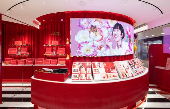 從赫芮亞標志性的黑白地板步入店鋪,整體呈紅色絨面質(zhì)感的墻面彎曲起伏,從視覺上創(chuàng)造出別具一格的律動感,為空間帶來和諧而流暢的精致時尚風格。左右兩面主墻以其巧妙的弧度充當完美向?qū)?,帶領體驗者在店內(nèi)多元而精致的系列新品中開啟探索之旅??臻g中央的寬闊長桌,不僅展示了Herrera Beauty赫芮亞美妝與Carolina Herrera香水系列的明星產(chǎn)品,同時也作為顧問咨詢區(qū),為顧客提供沉浸式的購物體驗。