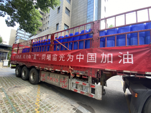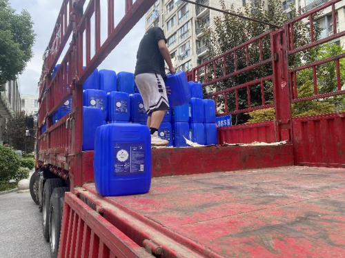 8月9日上午,志愿者們頂著驕陽將全部消毒物資裝車加固,將30余噸消毒液整齊裝車,并做好保護(hù)工作。