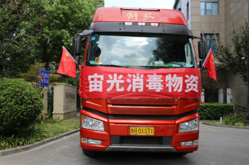 發(fā)車儀式結(jié)束后志愿者們坐著運(yùn)輸車輛即刻出發(fā),頂著驕陽奔赴中國(guó)鋼研科技集團(tuán)涿州基地。同時(shí)我們也提前聯(lián)系好了位于一千多公里之外的涿州市物資組工作人員在高速路口等待著消毒物資的到達(dá)。
