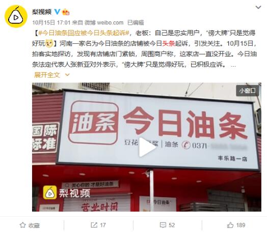 對于被今日頭條起訴一事,油條老板回應(yīng)亮稱“只是覺得“傍大牌”好玩。”