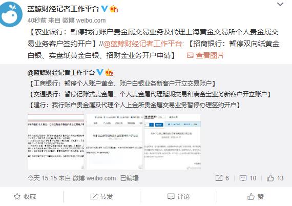 工商銀行、交通銀行、農(nóng)業(yè)銀行、建設銀行、招商銀行等集體發(fā)布公告,宣布暫停個人貴金屬交易開戶。