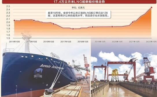 LNG船訂單“一枝獨(dú)秀”,造價(jià)也水漲船高。據(jù)中國(guó)船舶集團(tuán)經(jīng)濟(jì)研究中心方面透露,2022年10月初, LNG船新船價(jià)格為2.45億美元,較年初上漲14.5%,創(chuàng)下2014年以來(lái)最高水平。